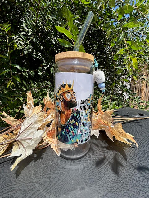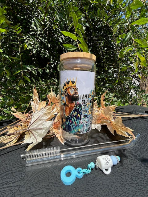 Sip with power, pride, and purpose. This 16oz glass can cup is designed to celebrate strength, resilience, and royalty. Featuring an inspiring “Black King” quote, it’s more than just a cup—it’s a daily reminder of greatness. Perfect for iced coffee, tea, smoothies, or any favorite drink, this durable glass is paired with a bamboo lid, reusable glass straw, and a straw charm for a stylish, eco-friendly touch.