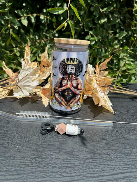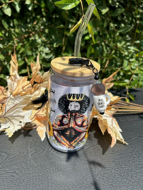 Sip with power, pride, and purpose. This 16oz glass can cup is designed to celebrate strength, resilience, and royalty. Featuring an inspiring “Black King” quote, it’s more than just a cup—it’s a daily reminder of greatness. Perfect for iced coffee, tea, smoothies, or any favorite drink, this durable glass is paired with a bamboo lid, reusable glass straw, and a straw charm for a stylish, eco-friendly touch.