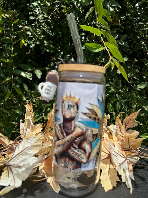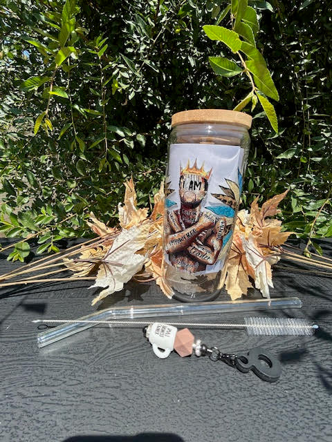 Sip with power, pride, and purpose. This 20oz glass can cup is designed to celebrate strength, resilience, and royalty. Featuring an inspiring “Black King” quote, it’s more than just a cup—it’s a daily reminder of greatness. Perfect for iced coffee, tea, smoothies, or any favorite drink, this durable glass is paired with a bamboo lid, reusable glass straw, and a straw charm for a stylish, eco-friendly touch.