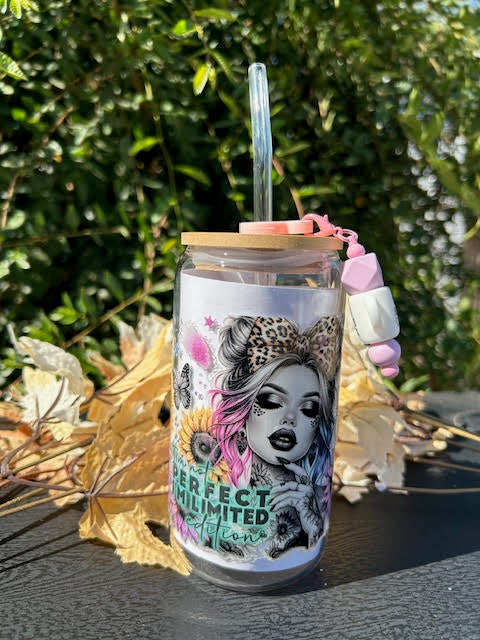 Radiate sunshine and free-spirited vibes with every sip. This 16oz glass can cup features a whimsical boho-inspired sunflower girl design—symbolizing warmth, positivity, and carefree beauty. Perfect for iced coffee, tea, smoothies, or sparkling water, it adds a touch of sunshine to your everyday routine.